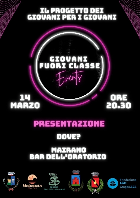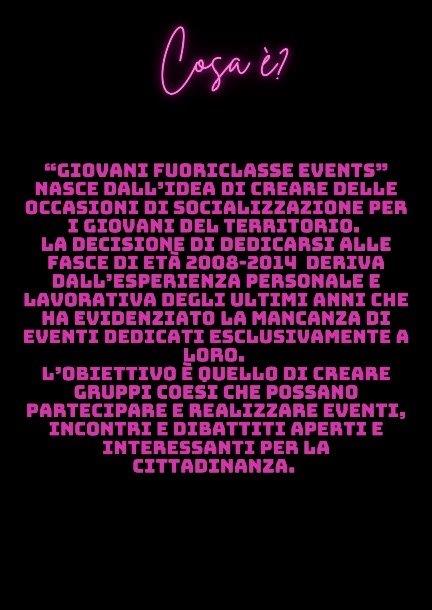 GIOVANI FUORICLASSE EVENTS" nasce dall’idea di creare delle occasioni di socializzazione per i giovani del territorio.